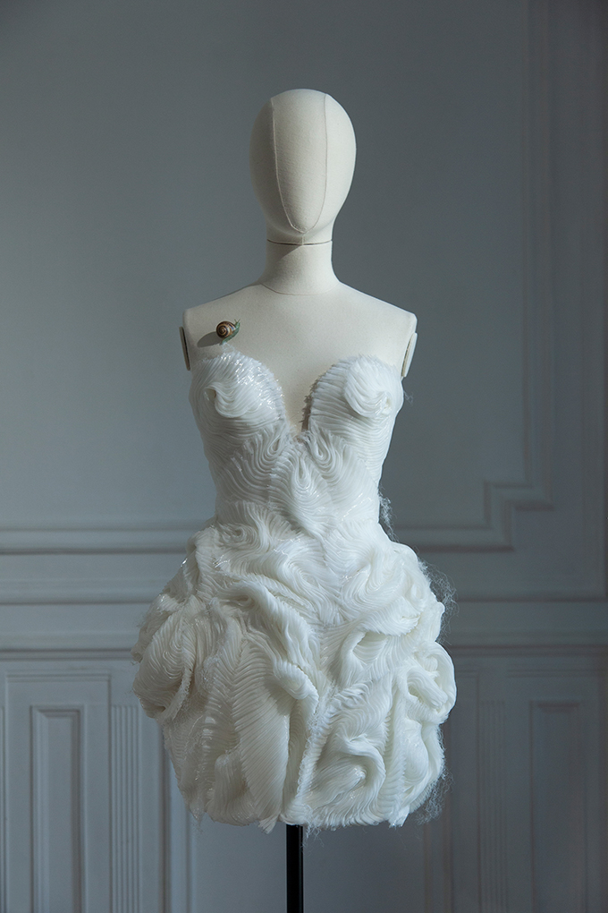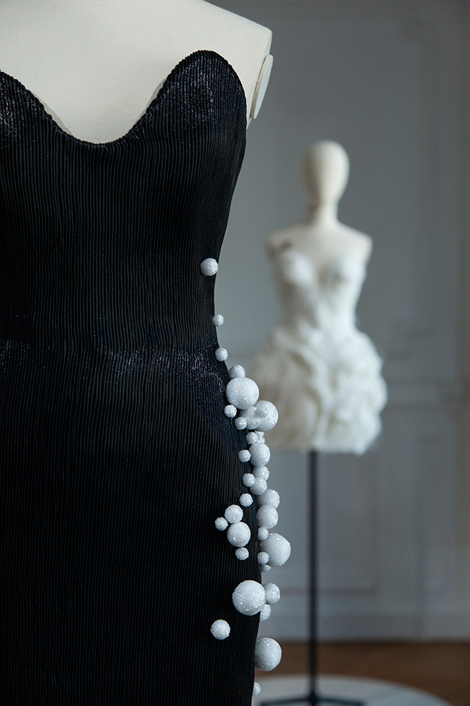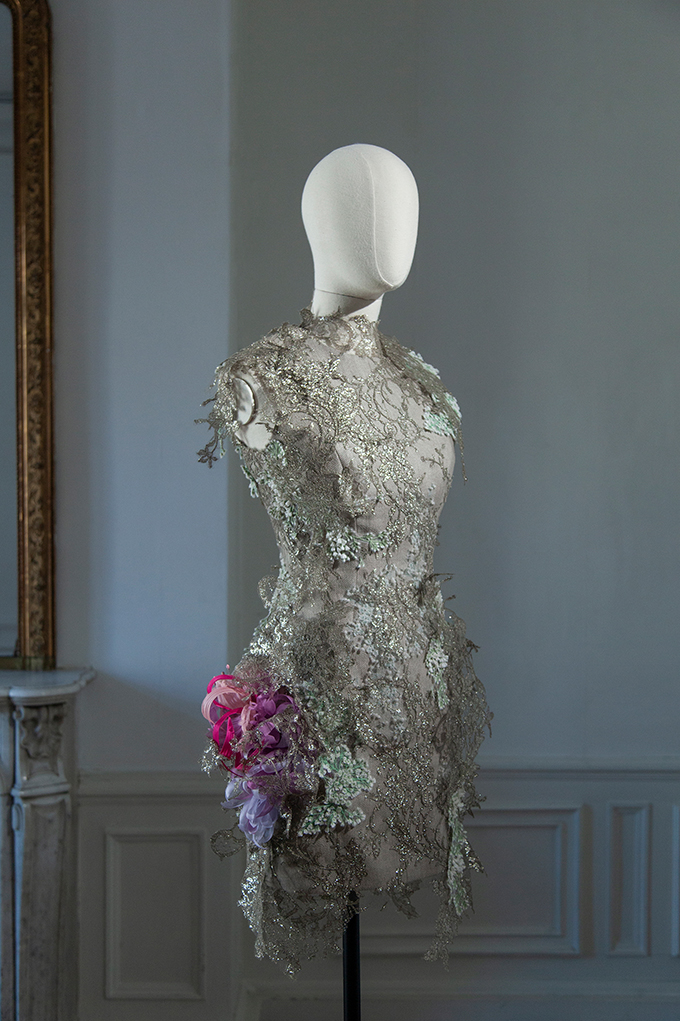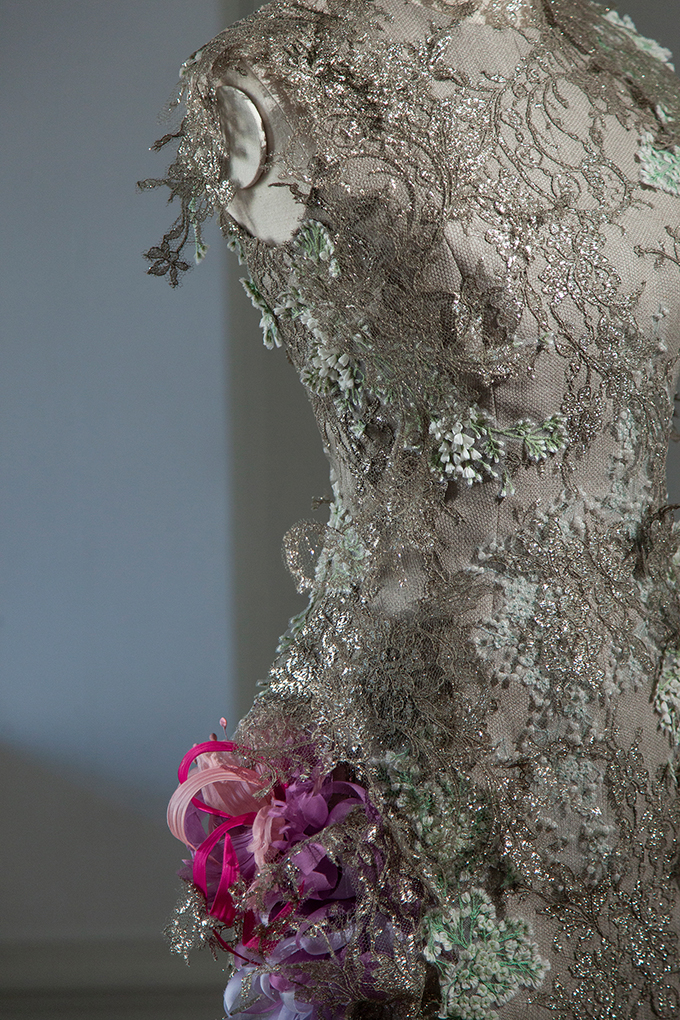 Each creation carries its own identity, imagined as a moving scene that follows the body’s rhythm. Together, they tell a story of change and transformation, suggesting the beauty of something unfinished and always evolving. Velvet petals become tassel-like patchworks, while crystals bloom like rare, exotic flowers.