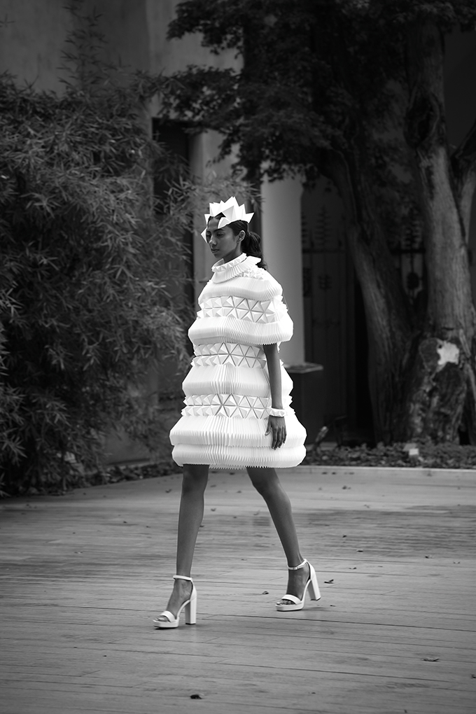 Paper has always fascinated me. It’s humble, accessible, and full of possibilities. As a child, I was always folding, cutting, and building small architectural models, never realising those same instincts would later define my artistic path. What drew me to paper was its duality: it can be both delicate and structural. That contrast between vulnerability and strength felt deeply human, and that’s what I wanted to express through fashion.