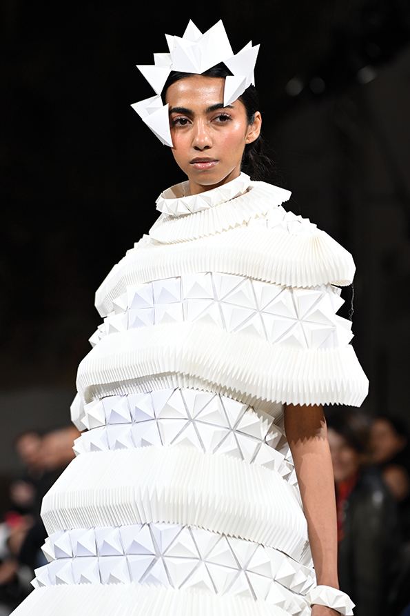 My background in architectural model-making naturally influences how I think about form. I design garments as I would construct a space, considering rhythm, proportion, and balance. But movement is essential. I build flexibility into the folds, using pleating systems that allow the paper to expand, contract, and flow with the body. It’s about finding equilibrium between sculpture and soul, between what stands and what breathes.