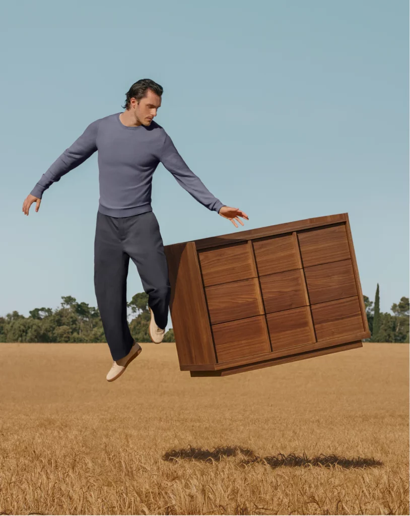 Filmed in the soft light of the Catalan countryside, the campaign captures a poetic moment: a woman reading in her living room as the walls dissolve into a golden wheat field, her furniture floating around her like memories. Some pieces fade, others remain, a metaphor for the quiet bonds we form with the objects that shape our lives.